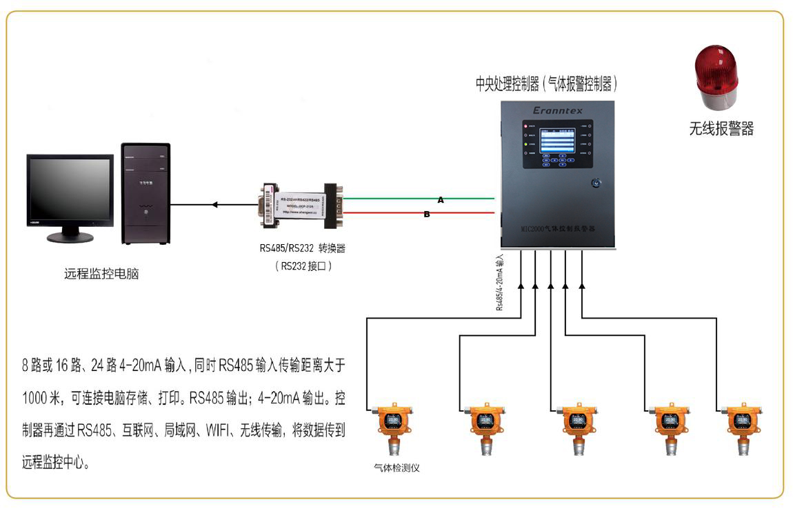 氣體報警控制器是一種氣體濃度監(jiān)測和泄漏集中報警控制器,電源由市電電網(wǎng)或蓄電池直接供電。本報警控制器接收RS485信號和4-20mA,暫時只能接收本公司新款在線檢測儀輸出的RS485信號,若需要接入其他廠家的標準RS485信號請聯(lián)系我公司進行確認。一臺氣體報警控制器可接入120路總線制RS485輸出氣體探測器和8路4-20mA輸出氣體探測器,更多輸入通道可訂制。